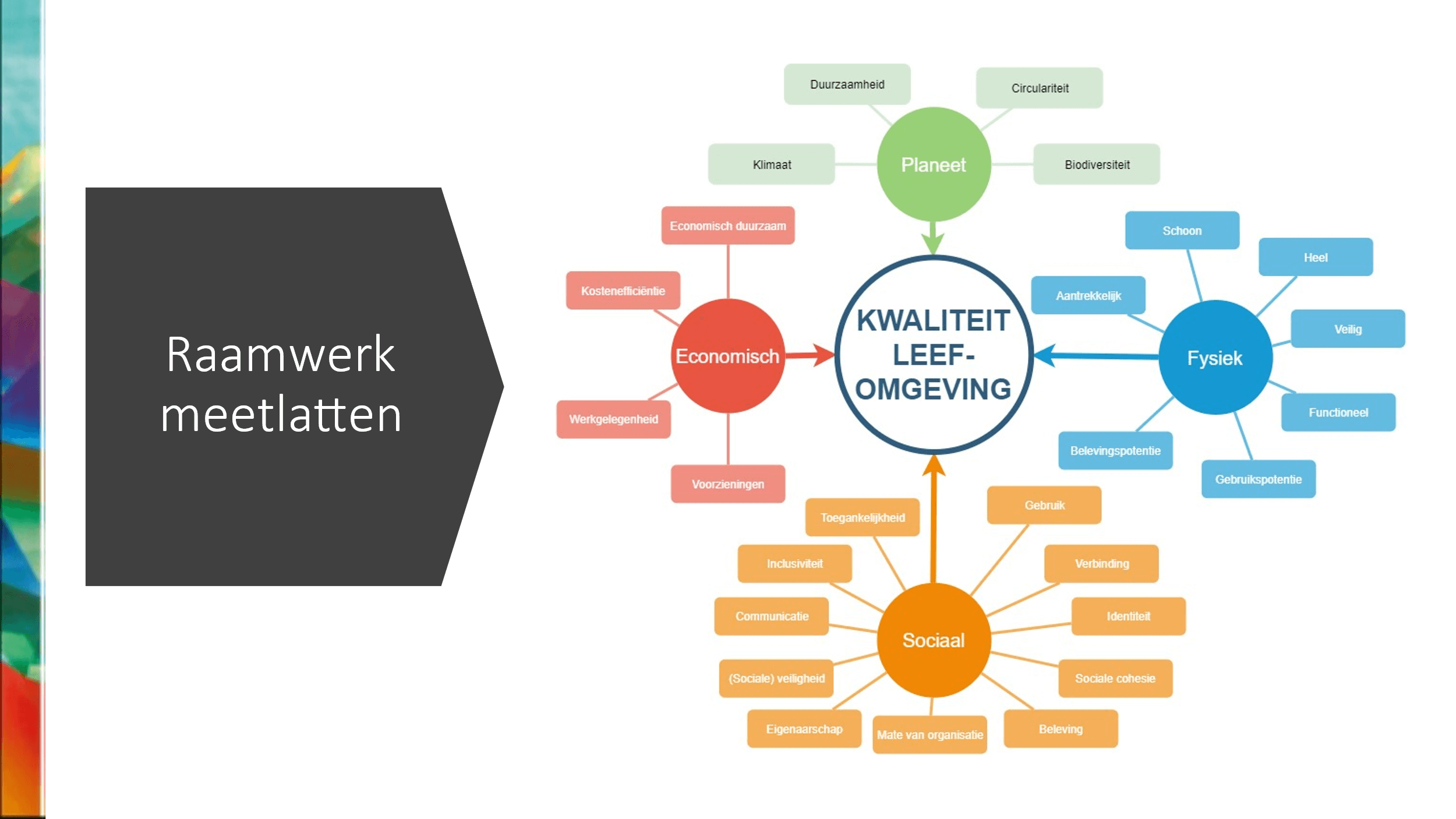 Het model werkt op dezelfde manier als een beeldmeetlat: op een vijfpuntsschaal worden waarden in beeld gebracht. Hierbij worden niet alleen foto’s maar ook icoontjes en teksten gebruikt om een bepaalde waardering te geven. Sjaak: “Het belangrijkste doel van het waardenmodel is inzicht bieden in de omgeving en richting geven aan wat nodig is om een positieve bijdrage te leveren aan de leefbaarheid in een gebied. Dat kan op stadsniveau, op wijkniveau of in de straat zelf.”